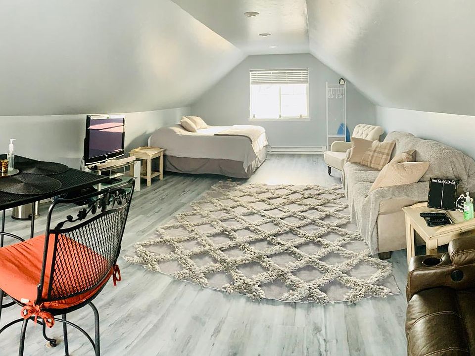 Unique+Loft is a new build garage converted living space located in a beautiful, quiet neighborhood. Just steps away are some of the best landmarks Sheridan has to offer, including Kendrick Park and Mansion, Whitney Park, Big Goose River, and Main Street, where you will find restaurants, shopping and nightlife. The first floor is very spacious. Here you will find the kitchen, bathroom, and dining areas. On the second floor, you will find the King sized bed, pull out queen sized couch, a nice table for office work, and the entertainment center. The lights are adjustable and there's are two big windows if you prefer natrual lighting throughout the day. Both floors have their own heating and cooling systems. The Loft/garage is located behind our residence with two outdoor parking spaces. Wifi, television, utilities and garbage are included.