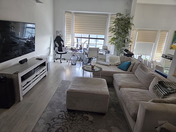 Top floor penthouse condo with large balcony facing views and street. Extra high ceilings and large windows allows for luninous light and views throughout the condo. Den opens to dining & living room, as well as the remodelled kitchen that includes all utensils and amenities. Furnished office area in den. T.V. & cable included in den & master bedroom.