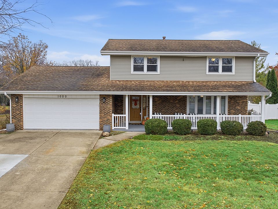 Welcome to your new home..... As you approach, you're greeted by an oversized front porch-perfect for relaxing and enjoying the outdoors. Step inside to find brand-new wood flooring, a large picture window that fills the space with natural light, and custom window treatments. Fresh paint and updated fixtures add a modern, move-in-ready touch throughout. The updated kitchen offers ample cabinet space and opens to a charming breakfast room and a cozy family room featuring a fireplace and custom window. A sliding glass door leads from the kitchen to your fully fenced backyard, complete with a spacious tiered deck, oversized concrete patio, and a shed for additional storage. The finished basement provides a versatile play/rec room and generous additional living space-ideal for entertaining or hobbies. Upstairs you'll find four generously sized bedrooms, abundant closet space, and two fully updated bathrooms. This home is truly turn-key and ready for you to move right in.