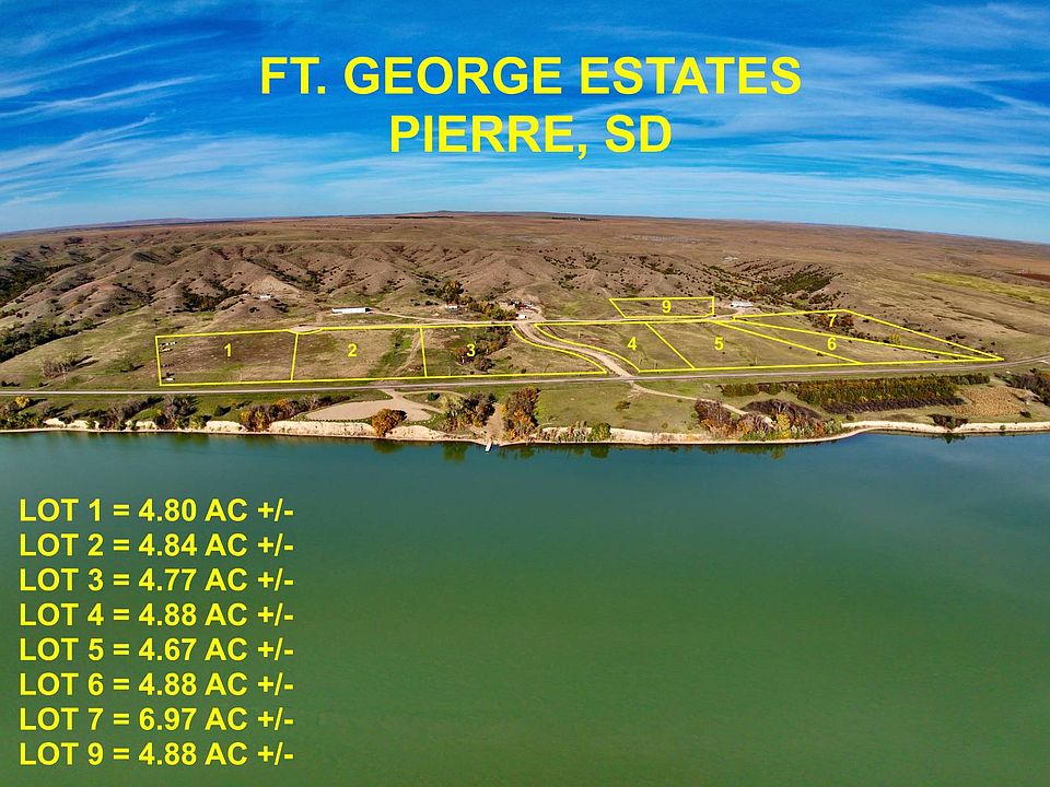 This 4.8-acre parcel, identified as Lot 1 in Ft. George Estates, lies in Hughes County, South Dakota, near the Lake Sharpe segment of the Missouri River. The property includes both electric and rural water onsite, allowing for immediate use and building your forever home, weekend retreat, or seasonal cabin. Lake Sharpe is one of the major Missouri River reservoirs stretching from the Big Bend Dam at Fort Thompson to the Oahe Dam at Pierre. The area is well known for its diverse outdoor recreation, including fishing, boating, and public hunting access along the river corridor. Numerous boat ramps and public recreation areas can be found nearby, offering opportunities for year-round enjoyment of the region's natural resources. Pierre, the state capital, is located roughly 15 miles north of the property and provides full services including groceries, fuel, medical care, and hardware. Nearby Fort Pierre, on the west side of the Missouri River, offers additional amenities, marinas, and historic sites. The location provides convenient access to both communities while maintaining a quiet setting suited to outdoor living. The combination of utilities onsite and proximity to major water and recreation areas makes this property a practical choice for those seeking acreage in a scenic and resource-rich area of central South Dakota. Buyers can use the land for a wide range of recreational purposes, including a dream home, hunting and fishing bases, or future rural development projects. All buyers should verify access routes, subdivision covenants, zoning, and utility details with local authorities. No representation is made as to fish or game populations or future property use approvals; independent due diligence is encouraged.