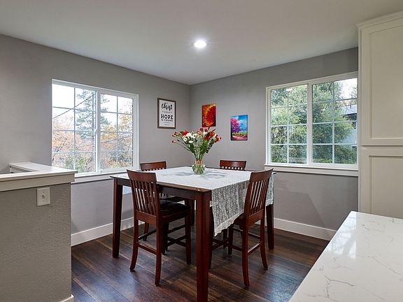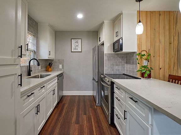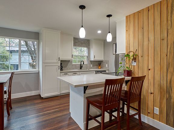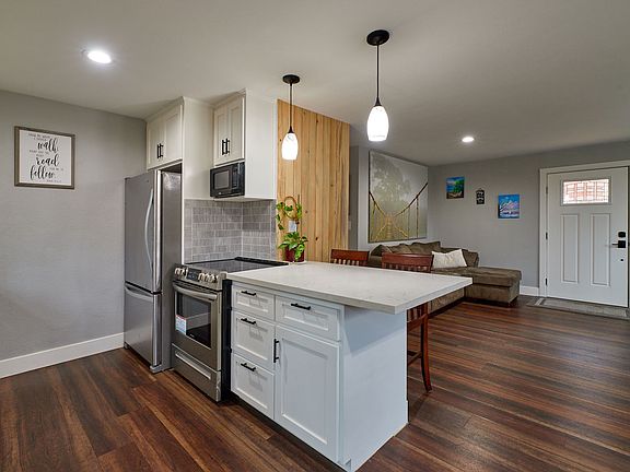 Marble-style countersOpen layoutBright white finishesOff-street parking