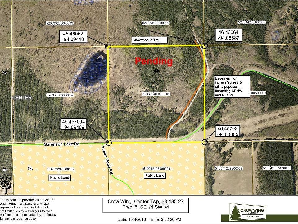 Here's a rare opportunity to own 40 acres of PotlatchDeltic land for hunting & potential homesite close to Brainerd. Located on Sorenson Lk Rd, this location has excellent deer, grouse & turkey hunting. A red pine plantation along the road creates privacy for your homesite while mixed pine & aspen further in are good for deer hunting. An easmnt runs through the property provides access to an adj 80 acre tract. Snowmobile trail being moved for 2019/2020 season. Addtl land available. Zoned RR 2.5.