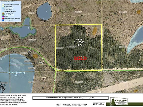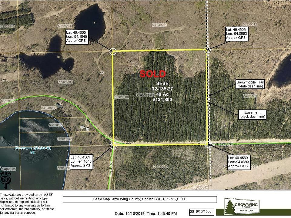 Nicely forested, this is a 40 acre upland tract just 3 miles east of Merrifield. Perfect for your next hunting/recreation adventure and/or homestead with lake recreation and snowmobile trail access close by. You will enjoy the secluded feel of a 26 year-old red pine forest, yet be only minutes away from area dining and shopping. Potential access to this tract from both paved Sorenson Lake Road and a shared easement road on the easterly border.