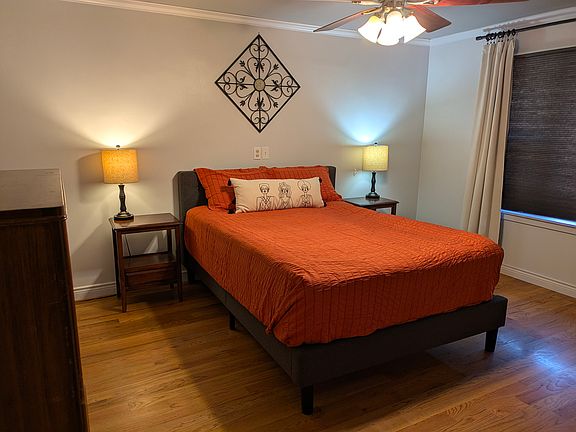 Upstairs ~ Kitchen with new granite countertops, Dining Room, Living Room with Fireplace, full Bathroom with shower/tub combo, 1 Queen Bedroom, and 1 Full Bedroom. All bedrooms throughout the home have room darkening shades. Downstairs ~ Laundry, second full size Refrigerator/Freezer, second Living Room with Desk Area, a Bonus Space which could be for exercise or a coffee bar, full Bathroom with shower, 1 Queen Bedroom, and 1 Twin Bedroom. Fully fenced pet-friendly backyard. Off street parking. High Speed Internet, Security, Utilities, and monthly common area Cleaning included. Up to 2 dogs welcome, by approval. Background check required. 30 day minimum stay.