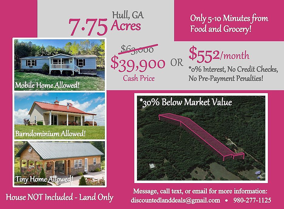 7.75 acres in Hull, GA **MOBILE HOME, TINY HOME, OR BARNDOMINIUM ALLOWED** FINANCING AVAILABLE! Discounted Cash Price: $39,900 Owner Financing Available: $42,900 @ 0% interest. $15,000 down and $552.18/month for 60 months. *Monthly payment includes Insurance and Property Tax. NO CREDIT CHECK REQUIRED, NO EARLY PAY OFF PENALTIES! Make this rural Georgia property yours today! Zoned ‘general agriculture’, this property has so many possibilities as to what you can do with it! Build a site built tiny home, modular, barndominium, or stick built home or place a mobile home on the property. Enjoy a farm with room for multiple horse trails or enjoy recreational play with outdoor ATV’s, motor bikes, and more! Property Details Address: Spratlin Mill Rd, Hull, GA 30646 County: Madison APN (Assessor’s Parcel Number): 0045 020 01 GPS Coordinates to locate property: 34.040798, -83.278418 Lot size: 7.75 Acres Approx. Dimensions: 399ft X 1714ft X 148ft X 1791ft X 146ft Building Restrictions: Unrestricted - Single Family Homes (Site Built Tiny Home, Mobile Home, Barndominium, Modular or Stick Built Home) Sewer/Septic: Septic Installation Needed Water: Well Installation Needed Electricity: Service provided by Jackson EMC Annual Property Tax: $554.15 Food 5 minutes away Grocery 8 minutes away Pharmacy 6 minutes away Hospital 16 minutes away World of Wonder Playground 19 minute drive Walker Park 15 minute drive Lake Chapman 22 minute drive Sandy Creek Park Beach 20 minute drive Athens 16 minute drive Atlanta 1 hour 30 minute drive Augusta 1 hour 50 minute drive Make this property YOURS for a cash discounted price of $39,900! We are motivated to sell - All cash offers will be considered! Message, call, text or email us today to get started. We make it super easy for you! 980-277-1125 discountedlanddeals@gmail.com Visit our Facebook page at www.facebook.com/discountedlanddeals to view all available properties! **As with any purchase of land, Buyer is responsible for verifying all information with the city/county as to what can and cannot be done with the property and confirm availability of any utilities/services for the property. Seller makes no warranties or representations about the land.