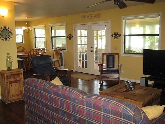 This home is a 3/2 on approximately 1/2 acre and has about 120' WF. The home is per the tax rolls 1472 sf and the detached 1/1 guest quarters, part of the workshop/garage, are approximately 400 sf with full bath, sink, refrigerator, and "hotel" cooling and heat. Nice screened porch. Floating dock for your boat. Most furnishings convey.