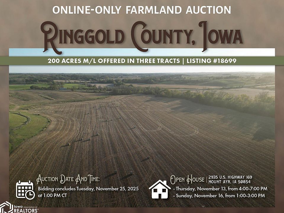 Ringgold County, Iowa Online-Only Land Auction! We are pleased to be representing the Elliott Family Trust in the sale of 200 acres m/l located just east of Redding, Iowa. The portfolio consists of three tracts situated in Section 9 of Middle Fork Township, Ringgold County, Iowa. The tracts will be sold via an online-only auction with bidding concluding at 1:00 PM CST on Tuesday, November 25th, 2025.  Tract 1: 160 acres m/l with an estimated 95.46 tillable acres and recreational opportunities Tract 2: 36.95 acres m/l (to be surveyed) with an estimated 16.17 tillable acres and suitable pasture ground Tract 3: 3.05 acres m/l (to be surveyed) building site with a 1,328 square-foot home built in 1951  This property offers a unique blend of productive row-crop acres, quality pasture, recreational opportunities, and country living. Offered as three individual tracts, buyers will have the flexibility to purchase the tract or combination of tracts that best fit their needs. The farm lease has been terminated and farming rights are available for the 2026 growing season.  *The Tract 3 open house will take place at 2935 U.S. Highway 169, Mount Ayr, Iowa 50854, from 4-7 P.M. CST on Thursday, November 13th & from 1-3 P.M. CST on Sunday, November 16th.*   *Property Taxes on Tracts 2 & 3 are estimated and will be reconfigured after closing*   *FSA Acres to be reconstituted on Tracts 2 & 3*  Visit our website for more information regarding this 3 Tract Online Only Auction!