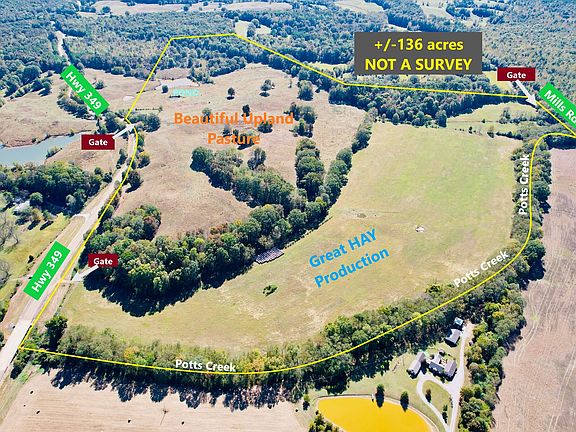 +/-136 ac. Marshall Co., MS: A gorgeous potential building site w/ long range landscape views! This rare property has rolling upland pasture, fertile bottomland hayfields, 1 large pond & 2 smaller stock ponds. Yr.-round Potts Creek forms the northern property boundary w/ apx. 3,200 ft. of creek frontage, apx. 1,600 ft. of paved frontage on Hwy 349 & apx. 620 ft. of paved frontage on Mills Rd. Currently used for cattle & hay production, it's fenced, gated, and ready to farm. Good deer & turkey hunting, with potential for duck habitat development. Perfect for a dream home, weekend retreat, or working farm. Just minutes from I-22 & ~1 hr. to the Memphis area, ~40 min. to Oxford, ~25 min. to New Albany & ~45 min. to Tupelo. All info. deemed accurate, but not guaranteed by Broker or Seller