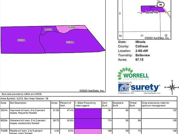 A great chance to own a highly-productive and entirely tillable farmland tract in the Mississippi River Bottoms. These 64.7± acres sit to the West of Highway 96 in the very North end of Calhoun County, approximately 5 miles South of Pleasant Hill. According to the tax records, there are 64.7 taxable acres although the FSA shows 67.15 tillable acres. It is entirely tillable acreage with a strong Productivity Index rating of 130.6. SNY Drainage District has committed to some ditch repair East of the highway that should help alleviate potential seepage along the Southern edge of the farm. With few historical transactions in this precise area, don’t miss the rare chance to lock in this great opportunity to expand your row crop acreage.