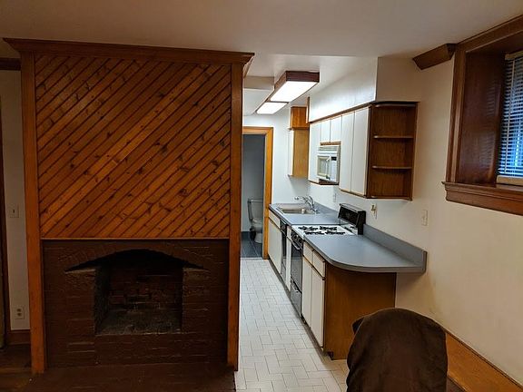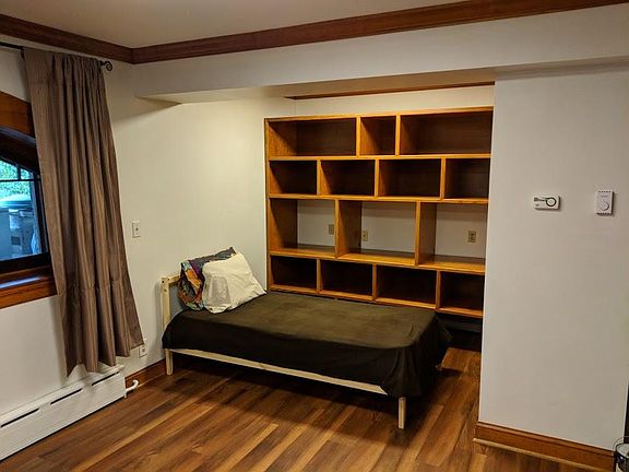 The apartment comes with a decorative fireplace, dining table, and chairs, ample built-in shelves, and a twin bedstead; the tenant supplies her/his own mattress.