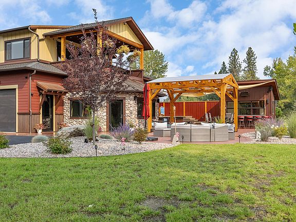 Custom built home on 6+acres, yet surrounded by 132 acres on the river bottom of the Bitterroot River. See lots of wildlife from the upstairs deck. The living area of this home is above the 4 bay garage. This home was built with natural light as the main focus. Large picture windows abound from every room. 3 bds and 2 baths are upstairs, with a 3rd bath on the entry level off of the garage. In-floor heat in every area of this home. The garage is finished with a his/her gym on the west end of the garage. Lots of equipment to utilize. There are views to the east showing the pond and the woods. Views to the west showcase St Mary's Peak and the Bitterroot mountains. If you like skiing, Lost Trail Powder Mountain is 1 hour south, and Snow Bowl Ski area is 1 hour to the North. The outside patio and bar are perfect for entertaining! There are heaters on the building and portable ones for chilly days and nights. The sound system is through out the entire house, garage, and outside area. Park your cars in this heated garage, with floor drains and hot water to wash your car in the winter. Soak in the hot tub on the deck and watch the stars or the sunrise, or sit around the outside gas fireplace or use the wood outside fire pit by the pond!