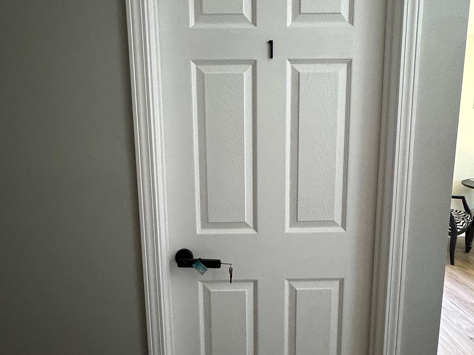 This front room is cozy yet beautifully updated, with modern finishes that make it feel warm and inviting. The room features a sleek black stone fireplace with tv space above, paired with a sparkling crystal light fixture that adds a touch of elegance. A wall mirror enhances this space for open feel