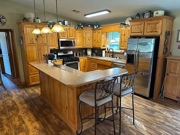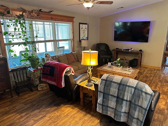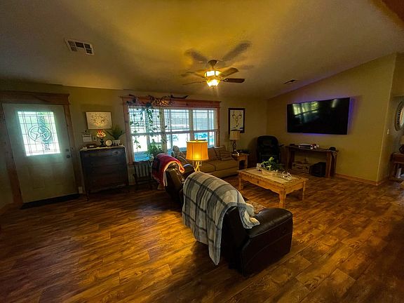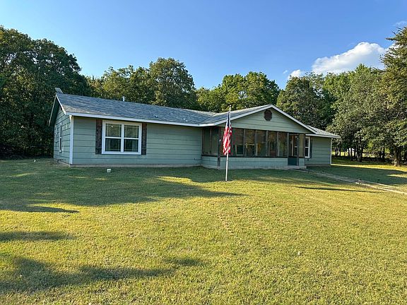 Here, you find an attractive, clean, well maintained three bedroom, two bathroom home. The front entry is protected by an enclosed porch that allows you to enjoy the great outdoors while being protected from the elements and kept comfortable by a small AC unit in the summer and the passive solar heat in the winter. An open concept living room, dining room and kitchen greet you once you enter the home. Your eye is drawn to the attractive wood cabinets and bar in the kitchen. Vinyl plank flooring makes it easy to keep clean and the vaulted ceilings give an expansive feel. A small back patio is ideal for grilling as it is only steps away from the kitchen through the back door. The laundry room, master bedroom and master bath are all down the hall behind the kitchen and living room. An entry door leads directly into the laundry room if you need a place to land after a long day outside. The master bath includes a large tub and shower. The two smaller bedrooms and bathroom are located on the other end of the house. All of the structures on the property are supplied with water from three water wells screened in the Arbuckle Simpson aquifer.
