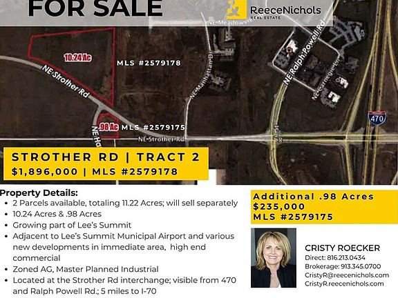 Prime location with access to major roads and highways. Approximately 1000' frontage on Strother Road...visible from I-470. Growing part of Lee's Summit. Adjacent to the Lee's Summit Municipal Airport. One of the last available locations off of Stother Road Interchange. Zoned Agriculture. Master planned Industrial. All utilities available. This property also listed under Commercial MLS# 2587079