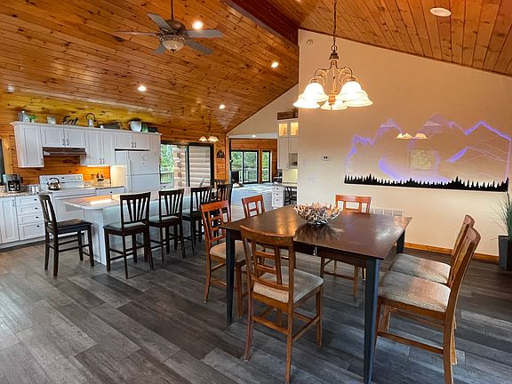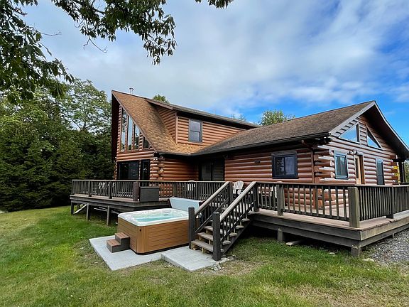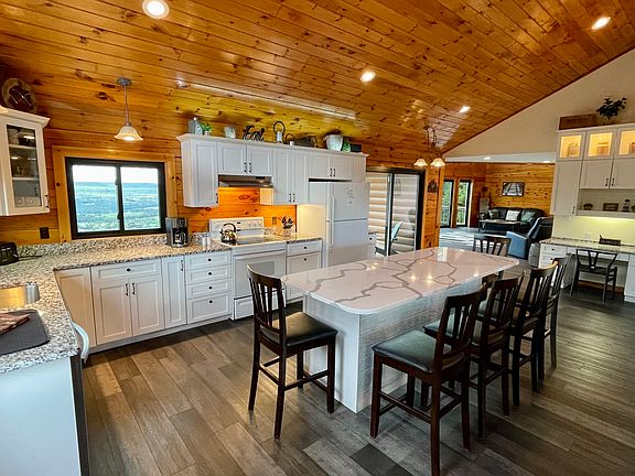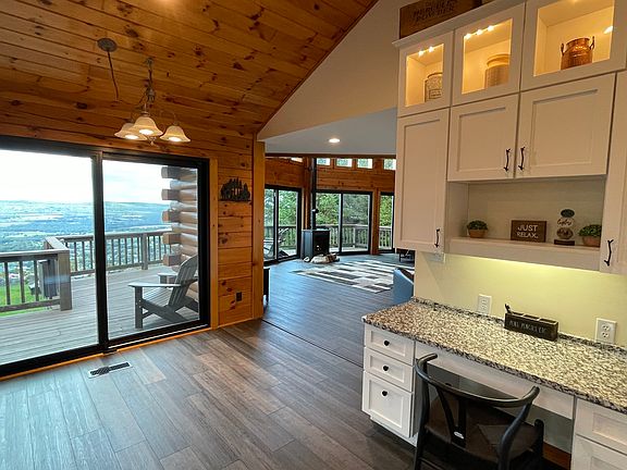 This modern chalet log-cabin rests high atop the mountain on 4 acres of serenity in Sugarloaf PA. The magnificent view overlooks the Conyngham valley and is ever changing. The 3 bedroom 3 bath open floor plan showcases the breathtaking view from almost every room in the house. Sugarloaf Summit is great for vacations any time of year. Kick back on the adirondack chairs and feel the rush of fresh mountain air completely relax you. Plenty of wildlife such as wild turkey, deer, porcupines and even the occasional black bear can be spotted. The 8 person salt water hot tub keeps the party going at all times of year. Central AC and individually zoned radiant floor heating make for an extremely comfortable space. A gas fireplace, 70" living room TV and concert level surround sound stereo system check all the boxes for 'over-the-top' accommodations.