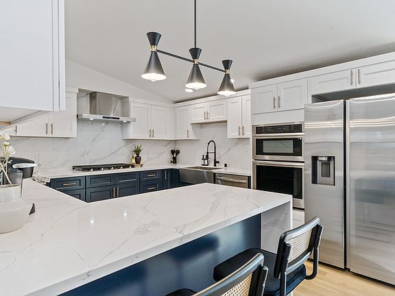 Experience a harmonious blend of elegance & comfort in this charming home. Rich tones from light hardwood flooring create a warm & inviting ambiance, while vibrant cabinetry, luxurious marble countertops, & dark blue accents provide a striking, sophisticated contrast.