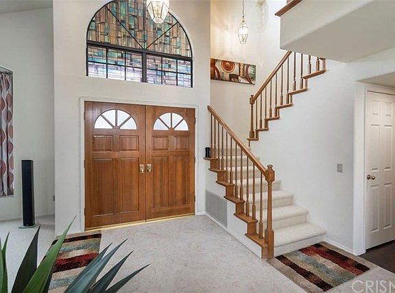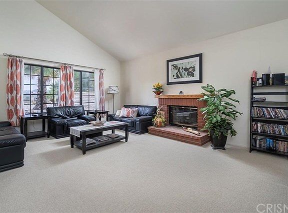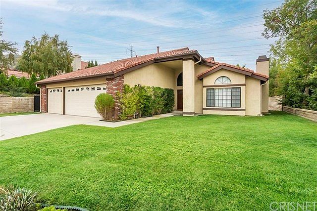 Nicely upgraded home with real wood floors, newer carpet and Travertine tile. Granite counters in the kitchen with breakfast bar , tons of kitchen storage, garden window to enjoy the back yard. Back yard is low maintenance with no rear neighbors. Covered patio with ceiling fan. Two fireplaces - one in the living room, one in the family room to enjoy the winter warmth and make decorating fun during the holidays. New sliding glass doors. Master bedroom has large walk in closet with cabinets for storage. Balcony off master to enjoy the sunset. Master bath has both tub and large glass enclosed shower. One bedroom and full bath downstairs for guests or Grandma. Newer heating and AC units and newer water heater. Home is very bright and cheery. No Mello-Roos. HOA is $90/mo paid bi-monthly, and includes tennis courts. HOA is super easy to work and sooo easy to contact . 3 car garage Award- winning Rosedell School, Saugus High School, major grocery store, Saugus Drug Store (with satellite post office inside) within walking distance. Several Mom and Pop restaurants also within walking distance.
