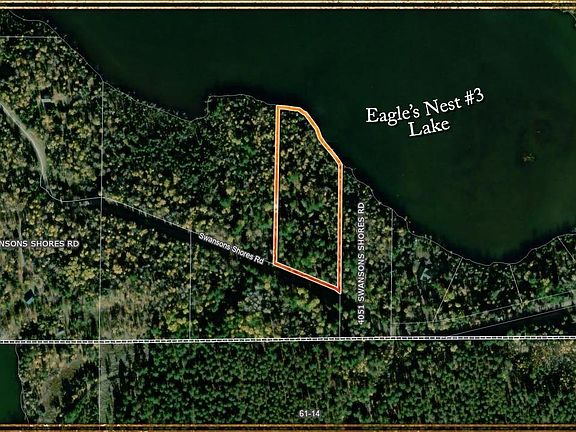 Gorgeous towering pine throughout this generous 4.5 acre lakeshore parcel on Eagles Nest 3. This lot is mostly level and features 463+/- feet of meandering shoreline with a portion on a point. Features include a driveway already built into the property; survey performed with corner pins, and lot lines flagged. Eagles Nest lakes are clearwater and known for their pristine clarity and many fish species. This lake has beautiful shoreline, islands, and undeveloped/public lands for exploring. A sought after location and ideal spot for a new year round home or a cabin.