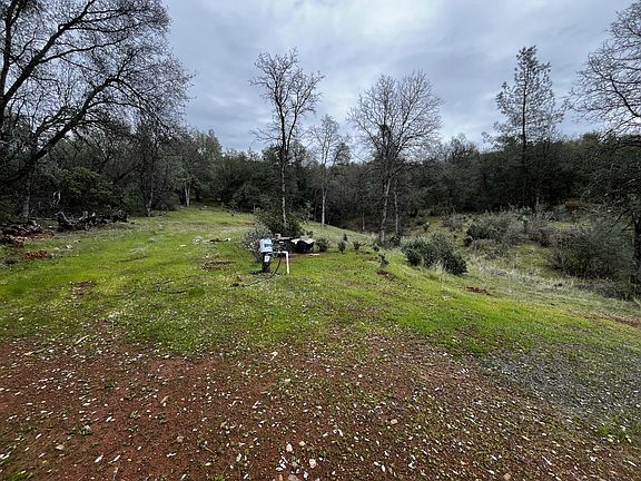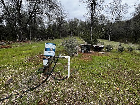 The property features a mix of natural foliage, open space, and a grassy hill, plus both a seasonal creek and year-round Oak Run Creek along the edge of the land. No power is currently connected, but the well runs with a generator and the open area is ideal for solar.