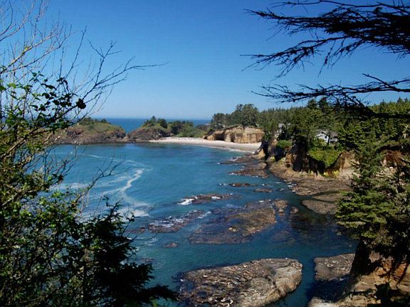 Ocean view possible from second story-trees have grown since main photo was taken. Mountain view to east.Located on a cul-de-sac, almost 3/4 acre w/creek on south side below. View of the Bay subdivision has Underground utilities & protective CC&R's to preserve views. Site specific geotechnical evaluation required with application for building permit. $150.00 annual HOA Fees.Min 1800 sq ft home. Buyer to check w/ planning for specific development requirements & information. No manufactured allowed. .Short walk to Bay, ocean, shops, galleries, restaurants, fishing & whale watching.