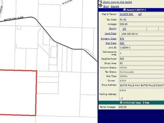 This property backs up to 200 acres of us forest service land. It is at the end of a long private road accessed from Butte Falls Hwy. There is a good possibility of a home site approval. even without that this would be a great site for camping to access the contiguous 200 acres if forest land for hiking, hunting etc. See map pin location as there is not an actual address for this property.