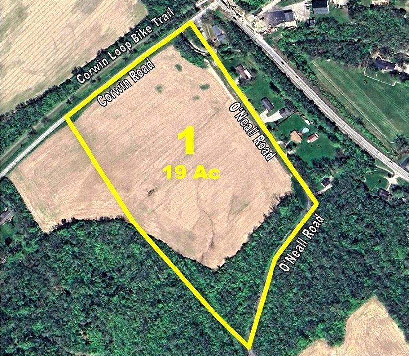 Tract 1: 19 acres of rolling farm and woodlands with 2,496 feet of road frontage at the corner of Corwin Rd and O'Neall Rd, providing excellent lot split potential just outside the Villages of Corwin and Waynesville and less than 4 miles west of Caesar Creek Lake & State Park. This well-located building site features approximately 2.5 acres of woods and is located directly across the road from the Corwin Loop Public Bike Trail leading from Waynesville to Morrow and beyond. This is a great opportunity for your own mini-farm with plenty of room for horses, livestock, and other country fun! The property is zoned R-1 (Residence Single Family) with nearly a half-mile of road frontage on Corwin Road and O'Neall Road, providing excellent investment potential to subdivide into multiple building lots with the Township's minimum lot requirements of 2 acres and 150' of road frontage. The property has been newly surveyed and is ready to build with public water available along Corwin Rd. Great scenic location less than 10 miles from Lebanon, Centerville, Springboro & surrounding areas and only 13 miles from I-71 for an easy commute to Cincinnati. This is one of 5 neighboring lots available on Corwin Rd and O'Neall Rd ranging from 6 to 19 acres. Great opportunity to purchase one or more neighboring lots to suit your family's needs. Call today for full details or to schedule a visit. Waynesville Schools.