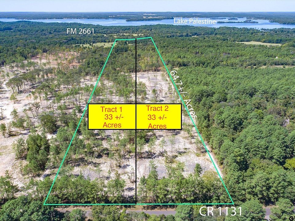 33 + or - Acres, to be determined by survey. Current survey shows 66.696 acres total which seller is breaking down into 2 tracts. They have done a lot of work clearing out the smaller trees and brush but left a lot of mature trees throughout. Each tract has approximately 370 feet of road frontage. Perfect spot to build your dream home or you can also subdivide out like the 84 acres they sold next door. Oncor electric and Dean water has been installed and runs across property. Dean water has 6 inch water line which is perfect for anyone looking to subdivide into subdivision. Close to Lake Palestine and 15-20 minutes out of Tyler. Deed restricted to site built homes only. Wildlife Abundant!