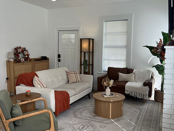 This inviting bungalow offers cozy, yet functional living areas, perfect for relaxing or entertaining. A non-functioning brick fireplace with a quartz mantle in the living room is the perfect complement to the home's historic charm blended with modern features. The laundry room features additional sleek white cabinetry and quartz countertops, paired with a newer washer and dryer.
