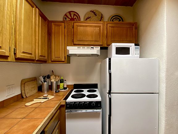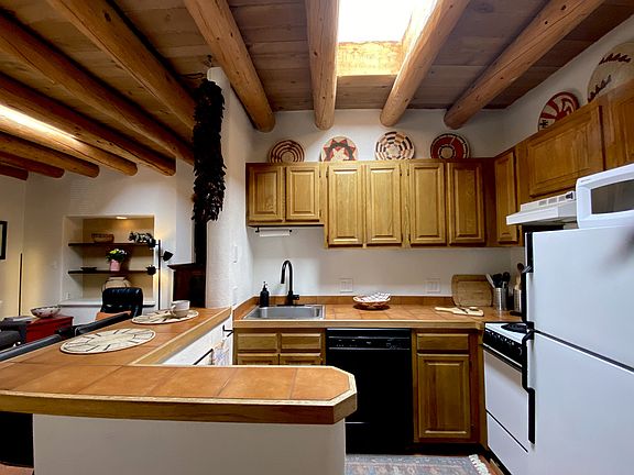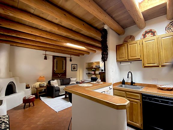 Located in the heart of Taos, this lovely and historic 1 bed/1 bath condo is warm, cozy, tastefully decorated, fully furnished and turnkey. Built in the 1800s, this condo has all the updated enrichments of the Taos experience. Vigas in the ceiling, a decorative Kiva fireplace, Saltillo tile floors, hot water base board heat, beautiful bathroom tile work and tasteful decorations in both a Southwestern and Mexican motif. There is a king size bed in the bedroom and a queen pullout in the sofa in the living room. Enjoy the luxury of cedar lined closets and cabinets. Located just two blocks from the plaza, you will have easy access to shopping, entertainment and dining. Everything you need is already here. Just move in!