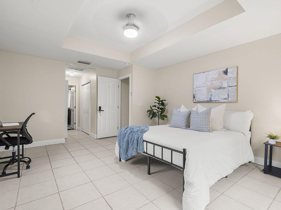 358 SF Ensuite with Full Bath, Tub and Shower, two closets, Tray Ceilings, west and north facing windows. Largest room in the house.