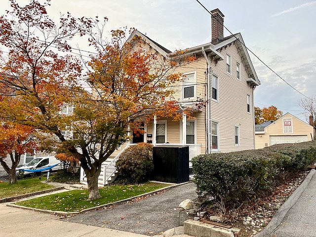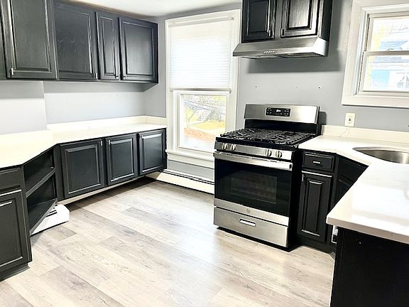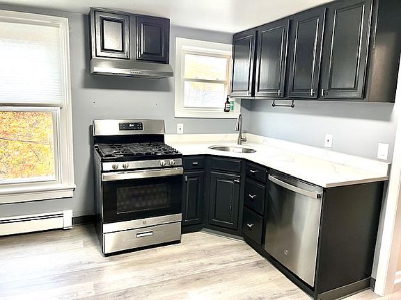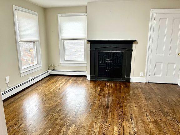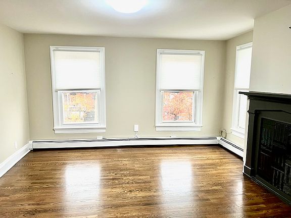 Bright Second Floor Apartment in 3 Family House. Living Room with Decorative Fireplace, Renovated Kitchen with Quartz Countertops and Stainless Appliances. Lots of Cabinets. Dishwasher. Two Large Bedrooms with lots of Light and Good Closet Space. Hardwood Floors throughout. Private Covered Deck. Shared Laundry in Basement, Best Location right in Town! Walk to All. 4 Block walk to Train. Street Parking. Private parking available for extra fee. Owner will consider small to mid-size dog.