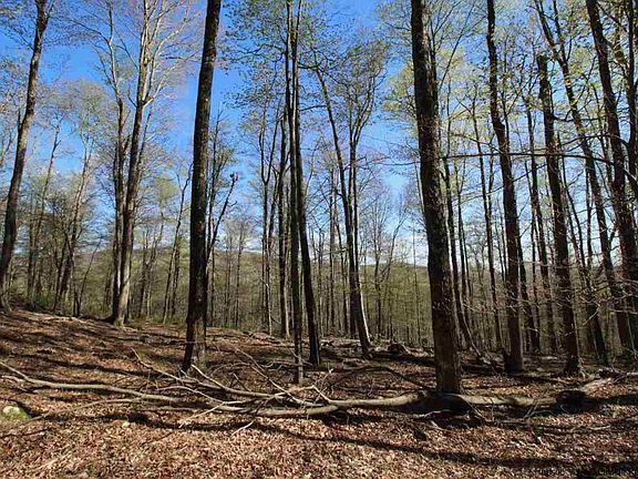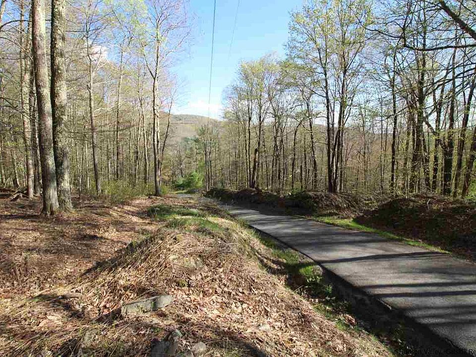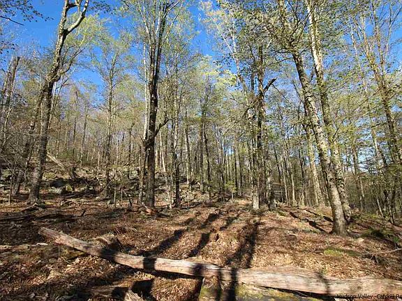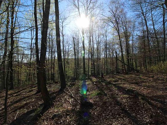 This vacant lot of 28+ acres is about halfway up an incredibly quiet, dead end, mountainside road in scenic Claryville. The lot is wooded with deciduous trees, and is pleasant walking terrain. The land is somewhat terraced, gently sloping up, then leveling, then sloping again, all the while the potential views increasing along with the elevation. The early spring photos show the silhouette of surrounding hills, including Red Hill, through the mostly leafless trees, so you can get a sense of what some clearing would open up in terms of view shed. There is a small spring you can hear flowing under ground further up the property. This may be a springtime run and I do not know if it is year round. The ground appears to be largely dry everywhere else. Claryville is known for being the source of the Neversink River, which has two branches that run through the town.