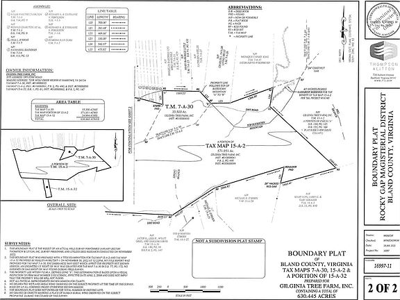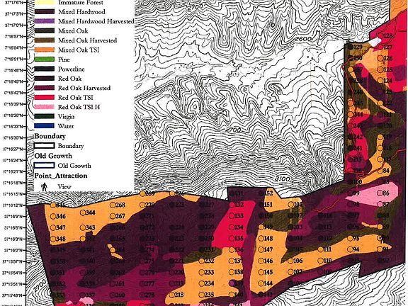 630 acres formerly part of the Gilginia Tree Farm. There are 3 parcels in Bland Co. (Tax Maps part of 15-A-2, 7-A-30, 15-A-32) This property adjoins 1500 acres of land owned by the Department of Conservation and Recreation. The property is accessed by a right of way off Wolfe Creek Rd. and another 40 foot right of way off Dry Fork Rd. The access off Dry Fork Rd is marked by yellow painted trees at the logging road entrance.