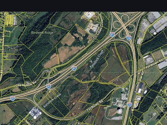 Prime Interstate Exit Location equals OPPORTUNIITY Properties like this one don't come along often and this one is priced to sell. This 2.3 acre parcel is right at the I-81 Exit 56 Tri Cities Crossing Northhbound Exit Ramp and offers City of Kingsport water, sewer, and services. Zoned B-4P (and likely rezoneable to other classifications) almost anything is possible from a store to a sales lot to lodging to just about anything you have in mind. Property lays well with Kendricks Creek crossing near the front, nearly flat between the street and stream, and gentle uphill slope beyond for minimal flood zone, easy bridgeability, and excellent visibility. Hurry, this may not last long!