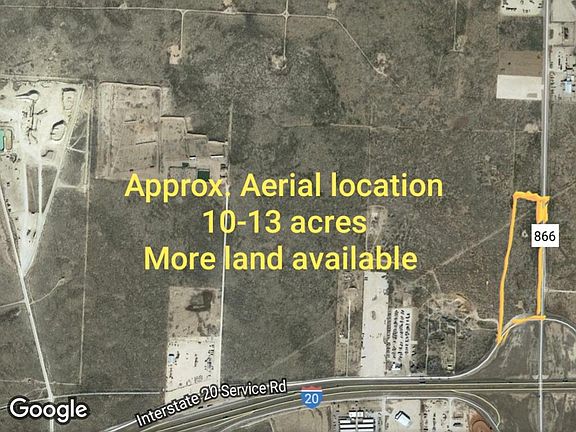 PRIME NW Intersection of I 20 W & FM 866 Odessa TX Prime Location for TRUCK STOP, HOTEL, CEMENT PLANT ANY COMMERCIAL OR INDUSTRY. No known Restrict. VISIBILITY AND ACCESS! High- dry land with Amazing Access both on I 20 W SVC Rd (off Interstate 20 W) and FM 866 with direct access back onto Interstate. Location is Prime Prime Prime!! Cleared land with Caliche pad. 10-13 ac. More avail. Won't last!