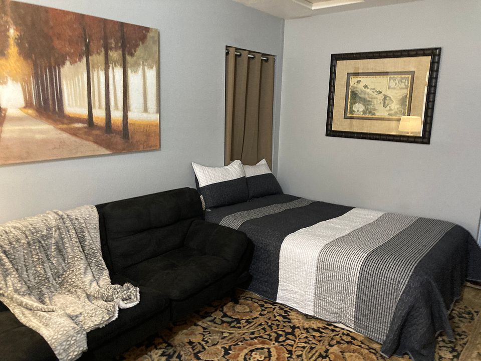 Cute little studio unit in BVS. This has all you need to make a cozy home! Kitchenette with sink, microwave, air fryer, Mini Keurig and hot plate along with a refrigerator. Good counter space. Wall mounted TV, electric heater. Dish ware, silverware, utensils and cookware provided. Furnished. Full bathroom. Private entrance, small storage shed out back, with a sitting area. Portable washer/dryer included.