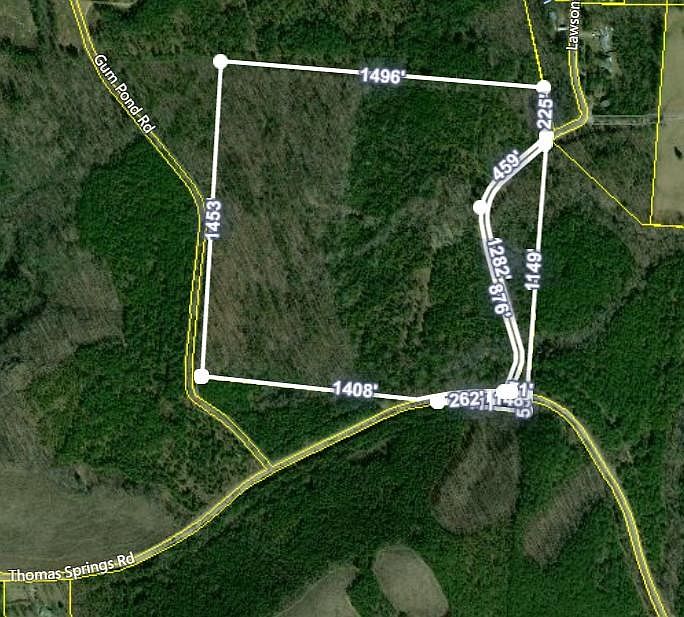 50 acres of wooded property, some hardwood & pine. Property is surrounded by over 12,500 wooded acres. Plenty of game, such as deer, turkey and wild hog. Electric, phone and water available at road. No restrictions. Couple of branches run through the property. Property fronts Thomas Springs Rd, Lawsontown Rd. and Gum Pond Rd.