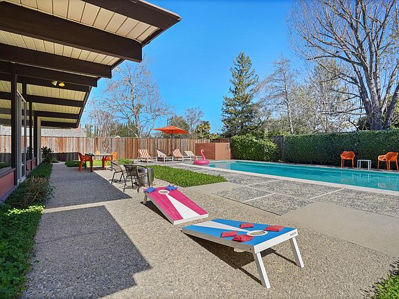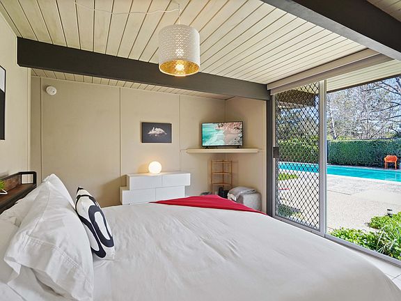 Welcome to our furnished, captivating Mid-Century Eichler Home - a stunning retreat where design meets comfort. This meticulously designed house, infused with the characteristic elements of Joseph Eichler, offers an expansive 2,100 sq ft of pure architectural elegance. Located in a quiet neighborhood, this stunning home boasts four inviting bedrooms, each bed fitted with new memory foam mattresses for a blissful night's rest. Our home features a 65" Smart TV, an outdoor pool, an atrium, and garage parking for 1 small sedan.