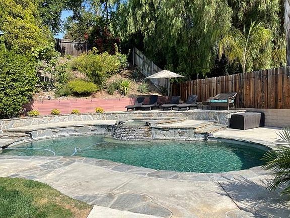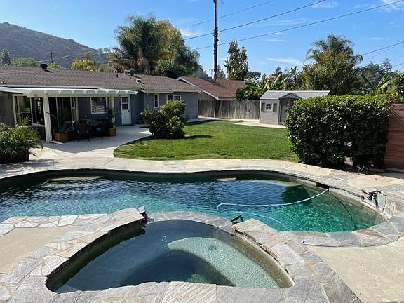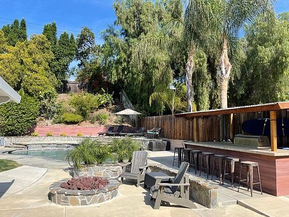 Fabulous and friendly neighborhood!! Walking distance to community center, schools, family and dog parks. Single story home with entertainer's backyard featuring a pebble tech pool and spa, built-in barbecue with huge cooking area, and a large grass area (.25 acre). Avocado and citrus trees. Large eat-in kitchen has been updated with granite counters, new cabinets, brand new appliances, AC unit, Roof and hardwood flooring. Spacious living room with fireplace and over-sized slider and picture window overlooking pool and outdoor entertainment area. Both bathrooms have travertine flooring. Master bedroom has a walk-in closet. Heater and air conditioner are NEW. Hallway and master bath have solar tubes for added natural light. Solar co-gen (low electricity bill). Matching Stone hardscape front and back. Front yard enclosed by vinyl picket fence. Over-sized custom stamped driveway and front entry walk. Converted garage (no car access).