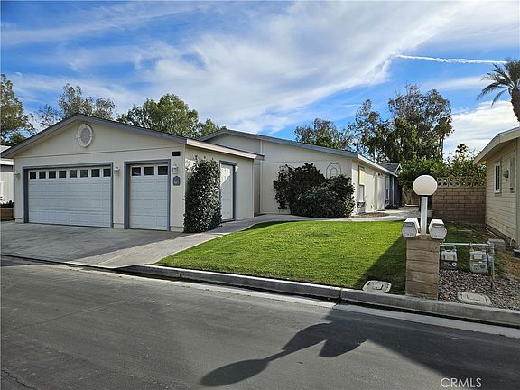PRICE REDUCTION! This stunning Fleetwood manufactured home in the popular Jack Ivey Ranch for seniors (55+) is located on the golf course (hole #5)! YOU OWN YOUR OWN LAND HERE (NO SPACE RENT)!!! This home is one of the biggest square footage (2,605) in the community and was built in 2000 with a 2-car + separate golf cart attached garage! Granite counter tops & stainless steel appliances (refrigerator included) in the kitchen, has many cabinets, an island, a breakfast bar & a walk-in pantry! The master bathroom also has granite counter tops, a walk-in level shower (room enough for a wheel chair), 2 sinks, a vanity and a separate lavatory room! Huge laundry room (washer & dryer included) has a deep sink, lots of cabinets & a large counter space to fold clothes! The hall bathroom also has granite counter tops, new shower & toilet and there are ceiling fans everywhere! Enjoy sitting in your alumawood patio while watching the golfers go by (there is a nice screen along the patio so golf balls don't hit your house...or you)! The amenities at Jack Ivey Ranch include: 4 pools & spas, billiards, golf, a restaurant, clubhouse with a library and card room, pickle ball, shuffle court, fitness center and beautiful views of the palm trees & snow-capped mountains! Very low taxes and the low cable & Internet bills are included in your HOA payment!
