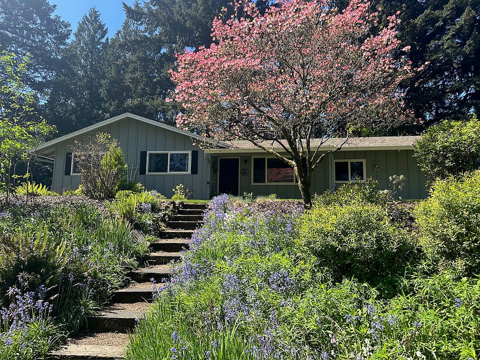 Step into our traveler's ideal getaway. This 3br 2ba home is tucked away up on a flag lot providing a quiet and private environment yet just minutes from everything! The beautiful lawn and garden welcomes you with the upper garden fully fenced in for any furry pals in tow. And there's a surprise feature just around the corner - an adorable a-frame office or quiet space is waiting for you - perfect for working from home. The yard also features a large playground perfect for kids.As you enter the home you walk into the cozy living room with a fireplace and 60" smart TV with surround sound. Just beyond there you'll see the large open kitchen and dining area that seats 6+. Just before going out to the covered and nicely lit garden area you'll pass a workspace that includes an adjustable standing desk (sit or stand to your comfort) and a beautiful ergonomic desk chair. The kitchen is beautifully lit with under cabinet lighting and is fully equipped with gourmet kitchenware and appliances.This home is beautifully lit throughout with dimmer switches, beautiful lamps, under cabinet lighting and skylight lighting, in the kitchen. The bathrooms have additional lights over the showers as well. From the hallway you will find the main bathroom with tub/shower combo and marble countertop. Next you will see the primary bedroom with a queen bed, adjustable heat and AC with the mini split unit, and a private ensuite with shower. The primary bedroom includes a sliding door out onto the garden patio and includes views of the adorable a-frame office. The a-frame office also includes an ergonomic desk (sit or stand) and desk chair.Short-term housing is similar to hotels; prices change based on demand and the seasonality of the year.
