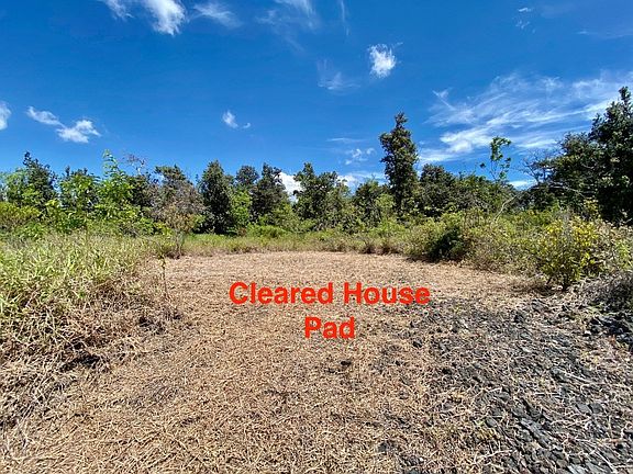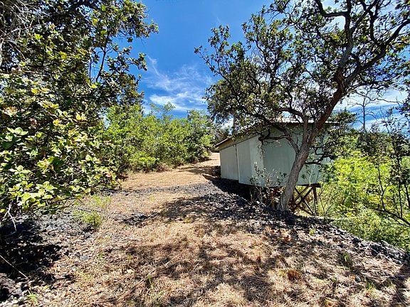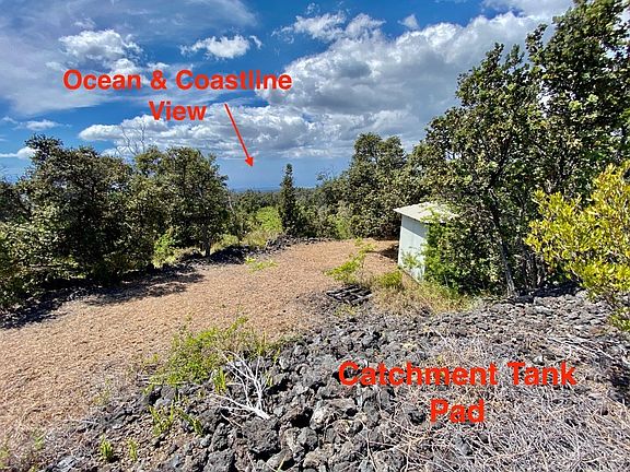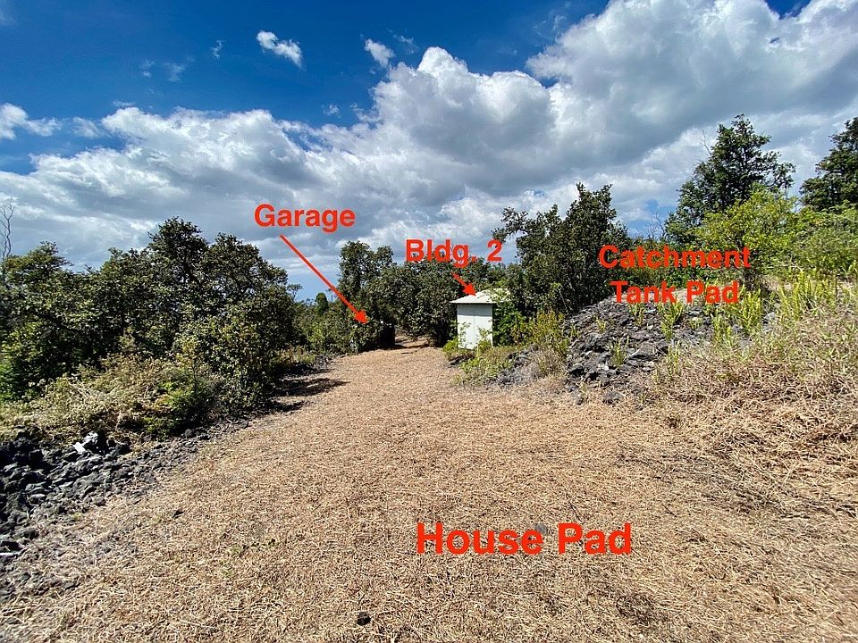 Unique 1 acre private lot w/long curved graded driveway, cleared-ready to build house pad, cleared area for a catchment tank, a 12X20 garage building and a 8X10 2nd building (both unpermitted). Owners started the process of turning this property into their Hawaii home but circumstances changed which now provide a new owner with a good head start on its completion. Clearing & grading has already been done! Just need the house. Nicely located in the lower half of Ocean View in a wooded, green area. Lot boasts an abundance of native Ohia trees and provides a nice balance of sun and shade. The buildings and house pad are farther up the long driveway and nestled behind the trees so they are not visible from the road. The house pad is at a higher elevation further back from the 2 structures and offers an ocean view through the trees. The garage was built in 2014 and was designed to support a vehicle with heavy duty, oversized framing and 2 layers of 3/4" plywood on the floor. Has a barn style sliding door on the front & a metal roof. The 2nd structure built in 2016 also has a metal roof and was going to be used to house a bathroom and laundry on one side and a water pump and filtration system on the other with the catchment tank to be located on a cleared area just behind it with the house pad directly above that. Both buildings have been broken into and the siding in sections damaged on the exterior. Possibly someone sleeping in the buildings at night. Seller selling as/is. Buyer to be responsible for any repairs and removal of unauthorized persons. Electric is available to permitted structures or go off grid and live off the land. Lots of options here. Conveniently located about an hour to major shopping, dining and such in Kona. Basic daily necessities just down the road including grocery stores, hardware store, post office, restaurants, veterinary clinic, hair salon and gas stations. FULL VIDEO TOUR OF THIS PROPERTY AVAILABLE UPON