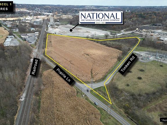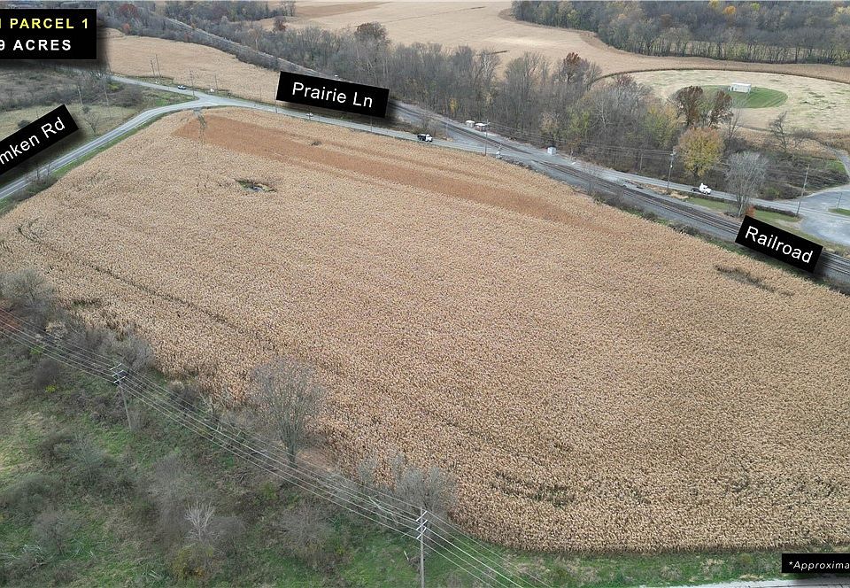 PARCEL #1: ±21.8 acres located between Timken Rd. and Prairie Ln., zoned I-2 (General Industrial), with approximately 14 acres of productive, tillable land currently planted in corn.