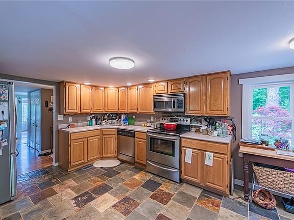 This captivating Cape, beautifully landscaped, including a lily pond and fruiting bushes is nestled against Oak Hollow Park! Huge living room with fireplace and flooded with natural light from all the windows. Beautiful updated kitchen with slate floor, first floor laundry, and super insulated, Geo Thermal heated home with gas and wood fire stoves make this comfortable home perfectly sustainable for resilient living- a prepper paradise. A very special property - Don't miss it!