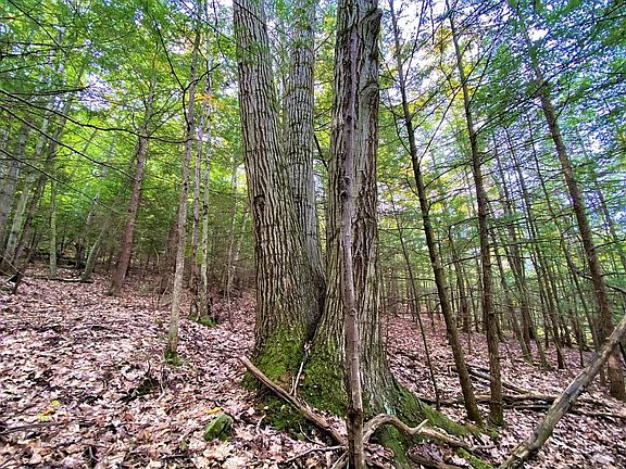 The gentle topography offers easy navigation, with a mixed stand of early-succession timber including oak, maple, pine, hemlock, and birch. Well-worn deer runs traverse the property, and a nearly level crown along the southern border abuts a large open field. Midway up the parcel sits a generous plateau—an active travel corridor for deer moving east and west between bedding and feeding areas, and a prime elevation for rut activity.
