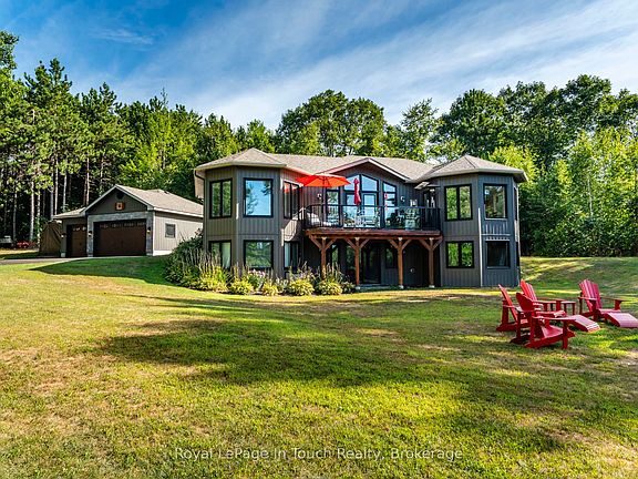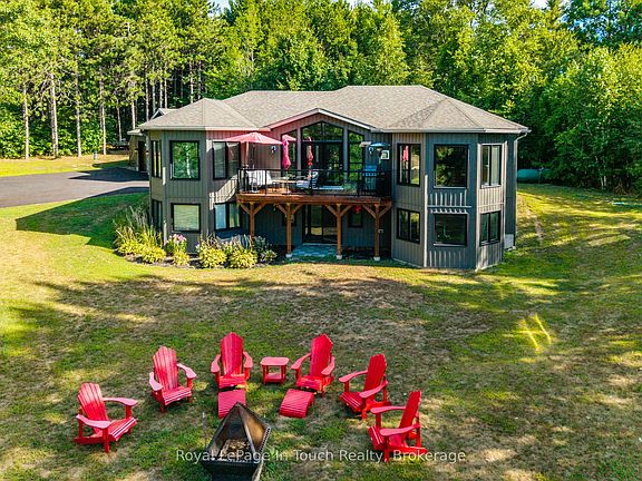 Private Location!!! Exquisite home set on a 2-acrematured-treed lot boasting phenomenal views and a large circular driveway with a triple-car garage. Perfect for a home or a recreation property, surrounded by nature, biking trails and sandy beaches. This property has an unspoiled lower level offering great potential and equipped with a walkout, large windows, and a rough-in for a bathroom. Incredible 1,000-square-foot, heated and insulated garage or workshop, complete with door lifts, an aluminum ceiling, and a 100-amp panel. Expansive backyard presenting a sizeable deck and a covered shaded entertaining area with the potential for a pool.