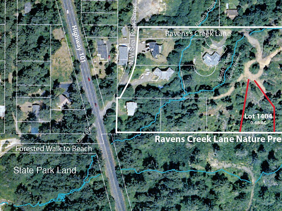 This is the last available lot within Raven's Creek Lane Nature Preserve. It is safely out of the tsunami zone with only a short, forested walk to Quail Street Beach, Seal Rock, with its tide pools and basalt headlands. This property comes with a permit for an ATT Septic System, building permit for 2bd 1,500 sq. ft. home, and design plans for either a 2br 1,500 sq. ft. or a 3bd 1,600 sq. ft. home. Utilities are right on the property line and include high-speed fiber internet.