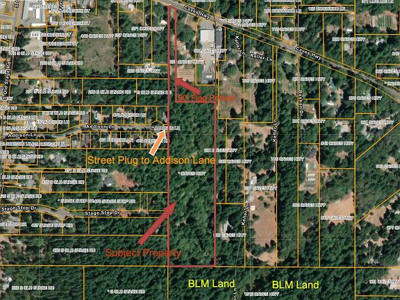 This property is located within the city limits of Cave Junction. Great opportunity for development of several lots, subdivision, or PUD! Per the city, property may be subdivided into two flag lots or have potential for a large subdivision with further development. Property is zoned SR. Minimum lot size for SR is 7,000 square feet if the property borders a city street. Property is separated from the end of Addison Lane with a street plug owned by the City of Cave Junction. The street plug could allow an extension of Addison Lane into the property for development of more streets for a subdivision. Property does have an old well, condition of the well is unknown. There is a P.P.L. power pole on the property with a transformer. Property is level with the vast majority of the property being densely wooded. Property backs to 40 acres of public BLM land. Flag portion of property is 50' wide. Buyer to perform necessary due diligence for their intended uses of the property. Owner will Carry.