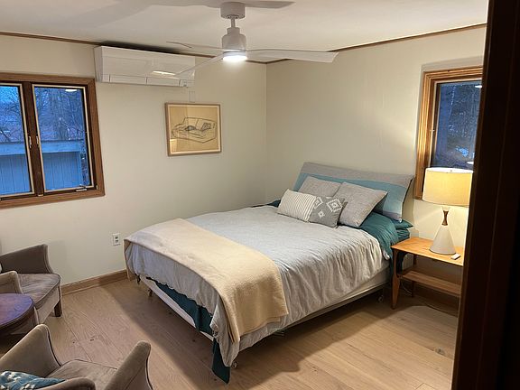 Furnished, stunning, move-In ready Berkshire Getaway. Lovely, glass-front, modern, four-season home near Otis Reservoir with lake access for canoe or kayaking... Available fully furnished winter/spring 2025/2026. New high-end appliances, granite counters, gas cook range and wood and gas fireplaces. 2/3 Bedrooms, with optional bedroom / office / 2 full baths. Downstairs laundry, and office areas. Plenty of storage, Attached 1 car garage with new washer dryer. New whole house electric heat pump for heating and cooling, and new wood stove and gas fireplace. Private yard, large wrap around elevated deck (no bugs), chairs, shed, lovely perennial plants, and partial lake and woods views.