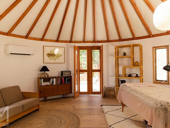 A highlight of the property is the private wellness yurt studio- a serene, light-filled space ideal for yoga, writing, wellness or creative practice. Thoughtfully designed to nurture balance and creativity, the yurt is equipped with a massage table, gongs, and other holistic elements. Outside, a clawfoot soaking tub and rustic outhouse add to the sense of peaceful simplicity and connection to the natural world. The Yurt Studio is available for special use upon request and additional fee when booking the whole property.